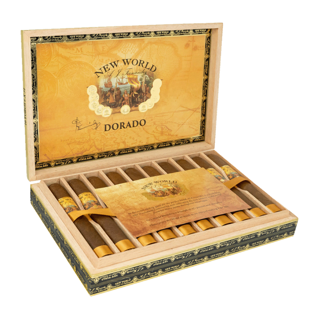 From the hands of AJ Fernandez comes New World Dorado, a Nicaraguan puro crafted entirely with tobaccos from AJ’s own farms — including the prized Dorado farm, named for its golden soil and sun-drenched leaf. Wrapped in a gorgeous Habano Sun Grown wrapper, Dorado delivers a bold, refined profile that lives up to its name.