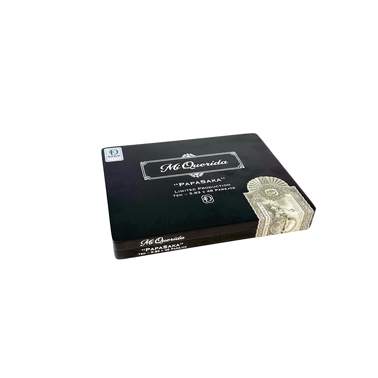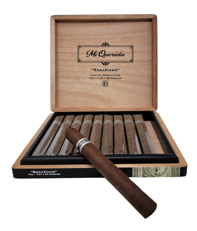 Mi Querida Black SakaKhan is a bold, full-bodied masterpiece crafted with a meticulous blend of long-fillers from the Dominican Republic, Honduras, and Nicaragua. A rich Mexican San Andrés binder brings depth, while a dark, toothy Connecticut Broadleaf wrapper seals it all with an intense, flavorful finish. Crowned with a pigtail cap, this limited-edition cigar offers layers of earth, espresso, dark chocolate, and spice — a complex smoke that builds with every draw.